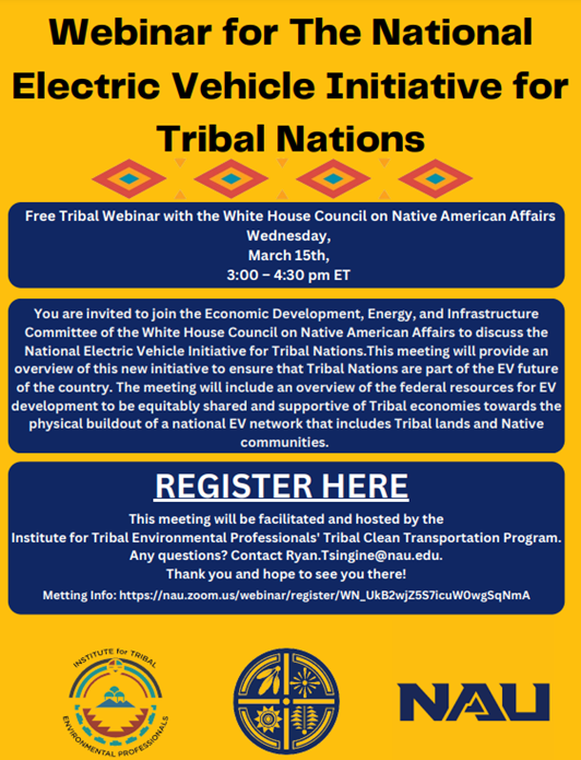 This meeting will provide an overview of a new initiative to ensure that Tribal Nations are part of the EV future of the country. The meeting will include an overview of the federal resources for EV development to be equitably shared and supportive of Tribal economies towards the physical buildout of a national EV network that includes Tribal lands and Native communities. This meeting will be facilitated and hosted by the Institute for Tribal Environmental Professionals’ Tribal Clean Transportation Program.